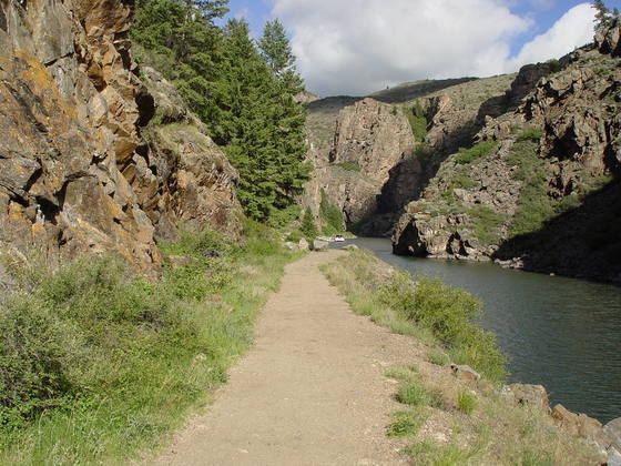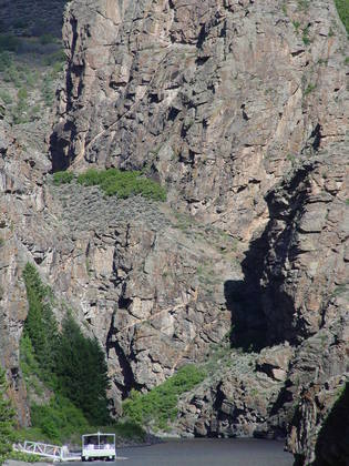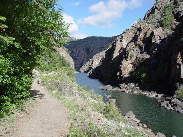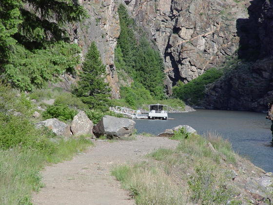 | This is the bottom of the Black Canyon of the Gunnison. We are walking on the original narrow guage road bed of the Denver & Rio Grande. You hike about 3/4 mi. to get to the dock. |
