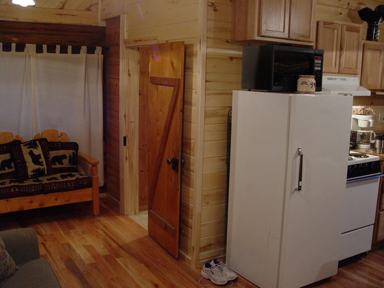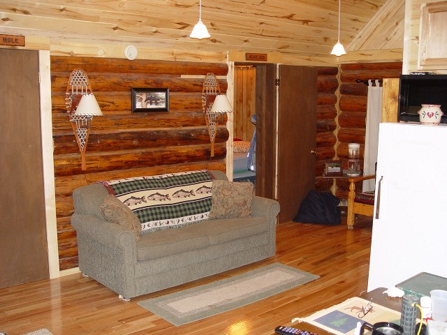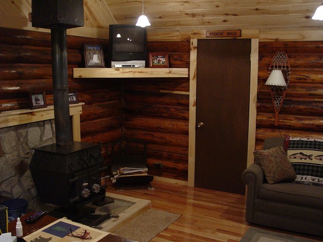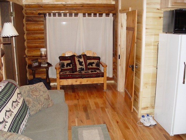 | The love seat, we pulled it up in front of the stove every evening. Note Betty's shoes, the cabin has a convenient place to store her shoes, since they come off the instant she comes in the door. |