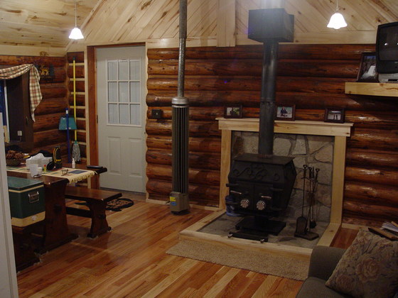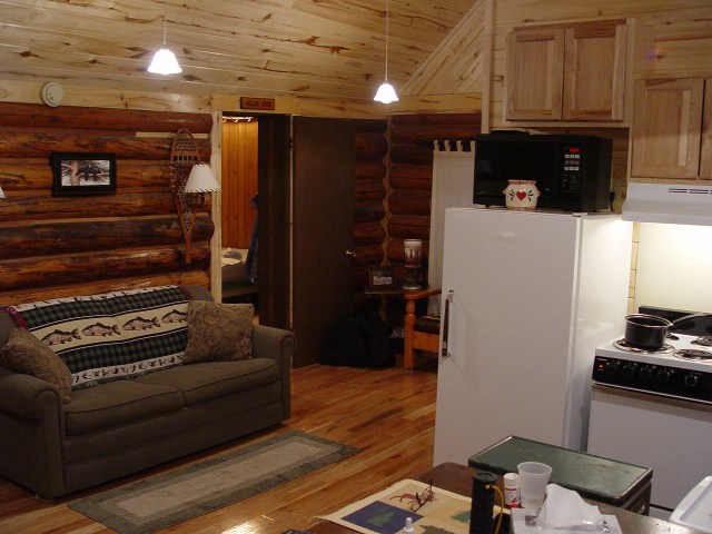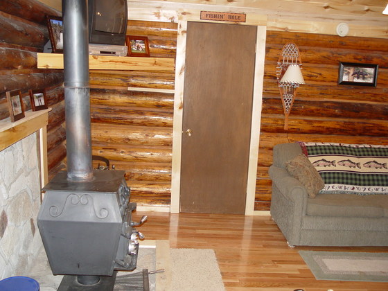 | Looking at the door, the wood stove and TV on the right, the dining area on the left. |