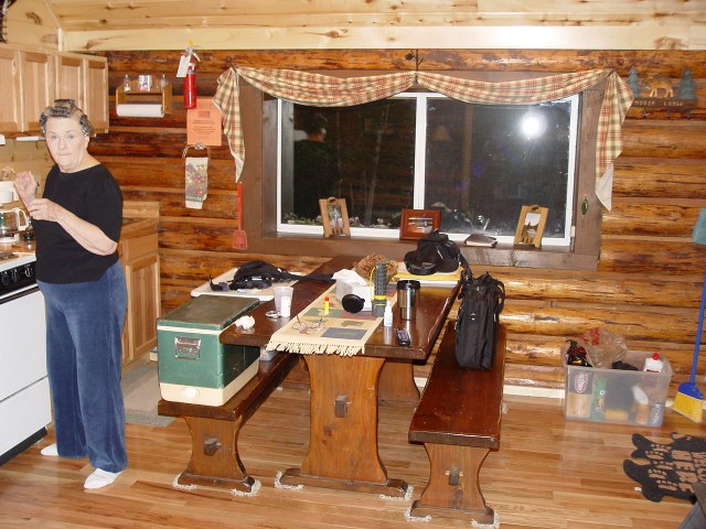 | Betty fixing breakfast in the kitchen, the dining area and our junk. You can see its dark outside, cause the sun hadn't come up from behind the mountain. |