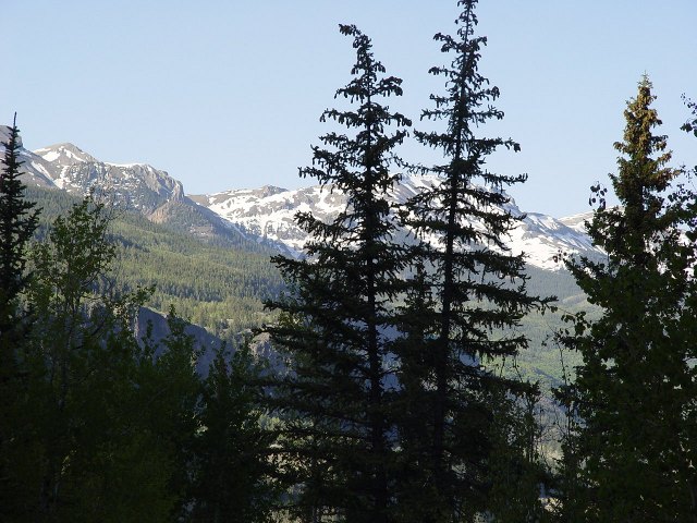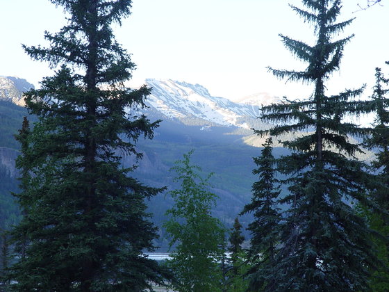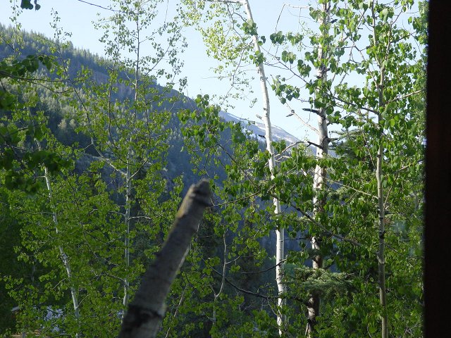 | This is from the cabin's porch in the morning, the sun is shining on the mountain tops to the south. |