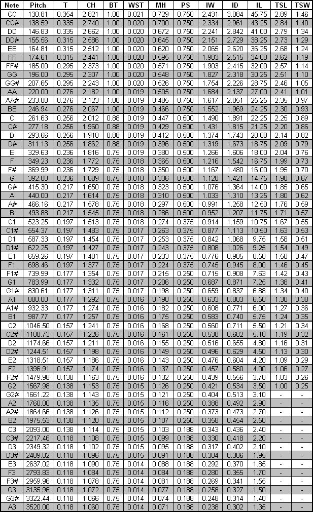 The Prestant pipes are identical to the Montre pipes except they are two notes smaller in scale. Here are all the dimensions (inches) for the Prestant pipes: