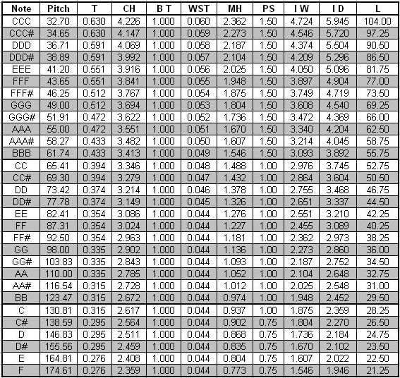 The scale I used for the Soubasse pipes is from the Laukhuff catalog for a medium Bourdon. The scale halves on the 19th note. The basic pipe design is from the Audsley book. Here's a sketch showing a front and cross section view of a Soubasse pipe followed by a table of dimensions (inches) for the entire rank: