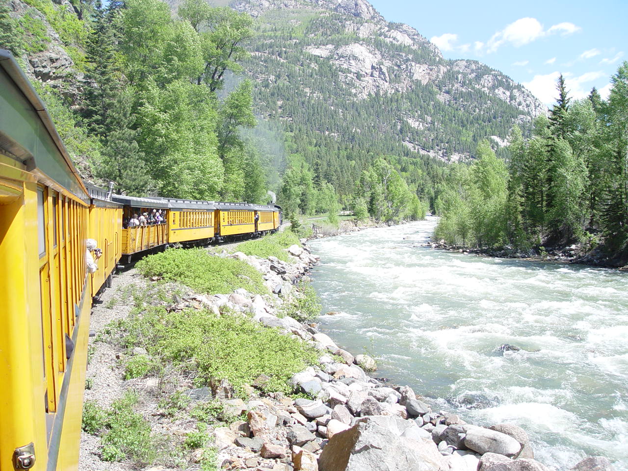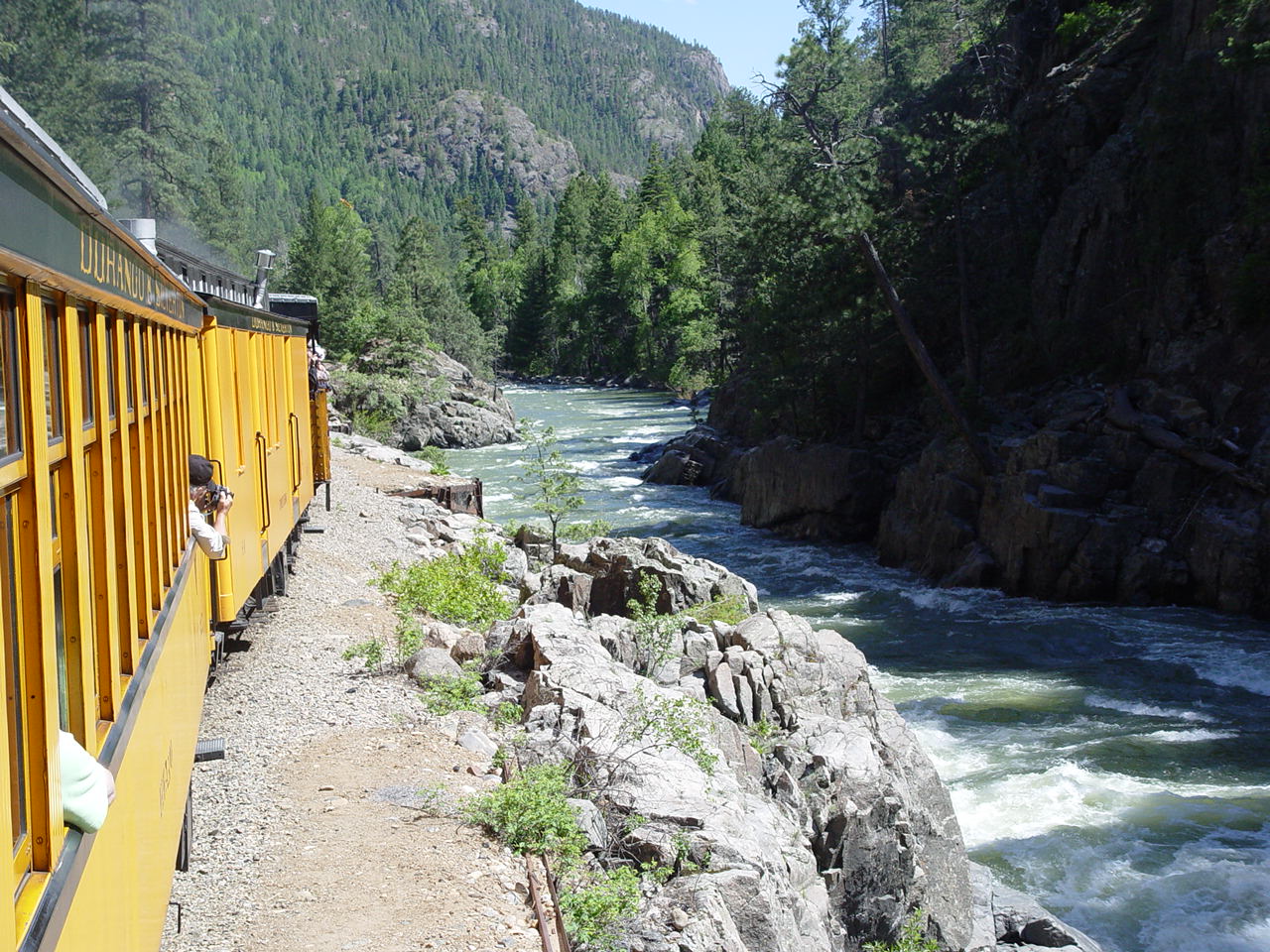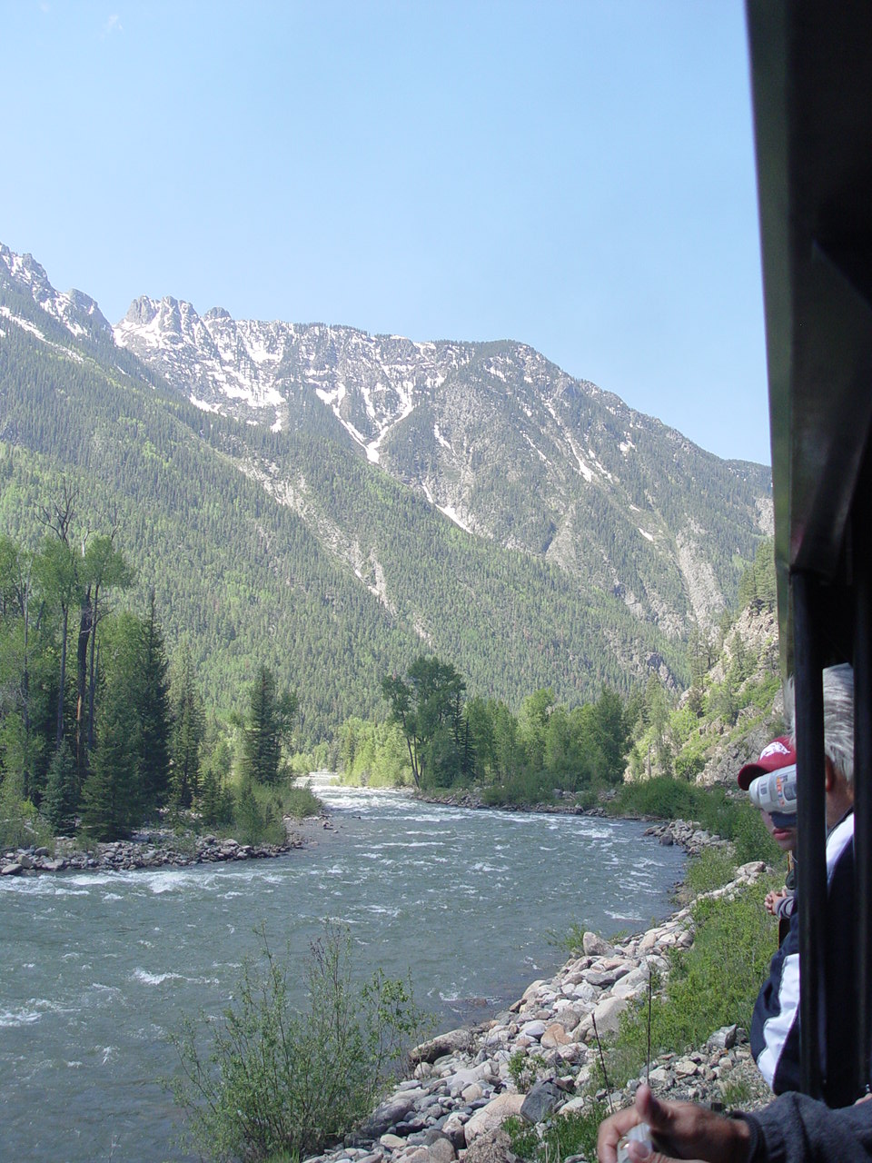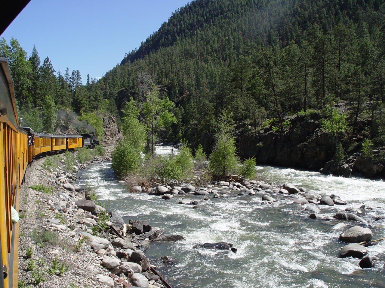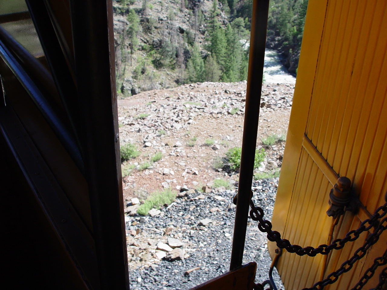 | Looking down at the Animas between the cars