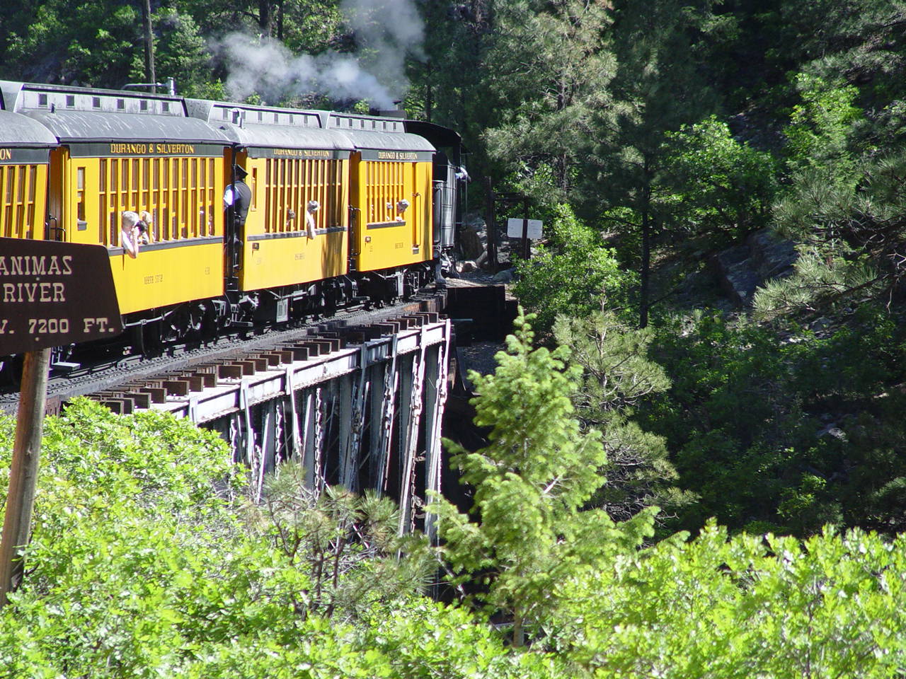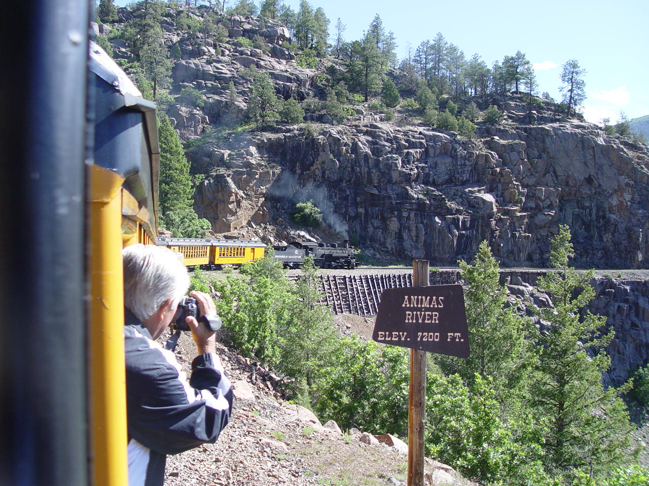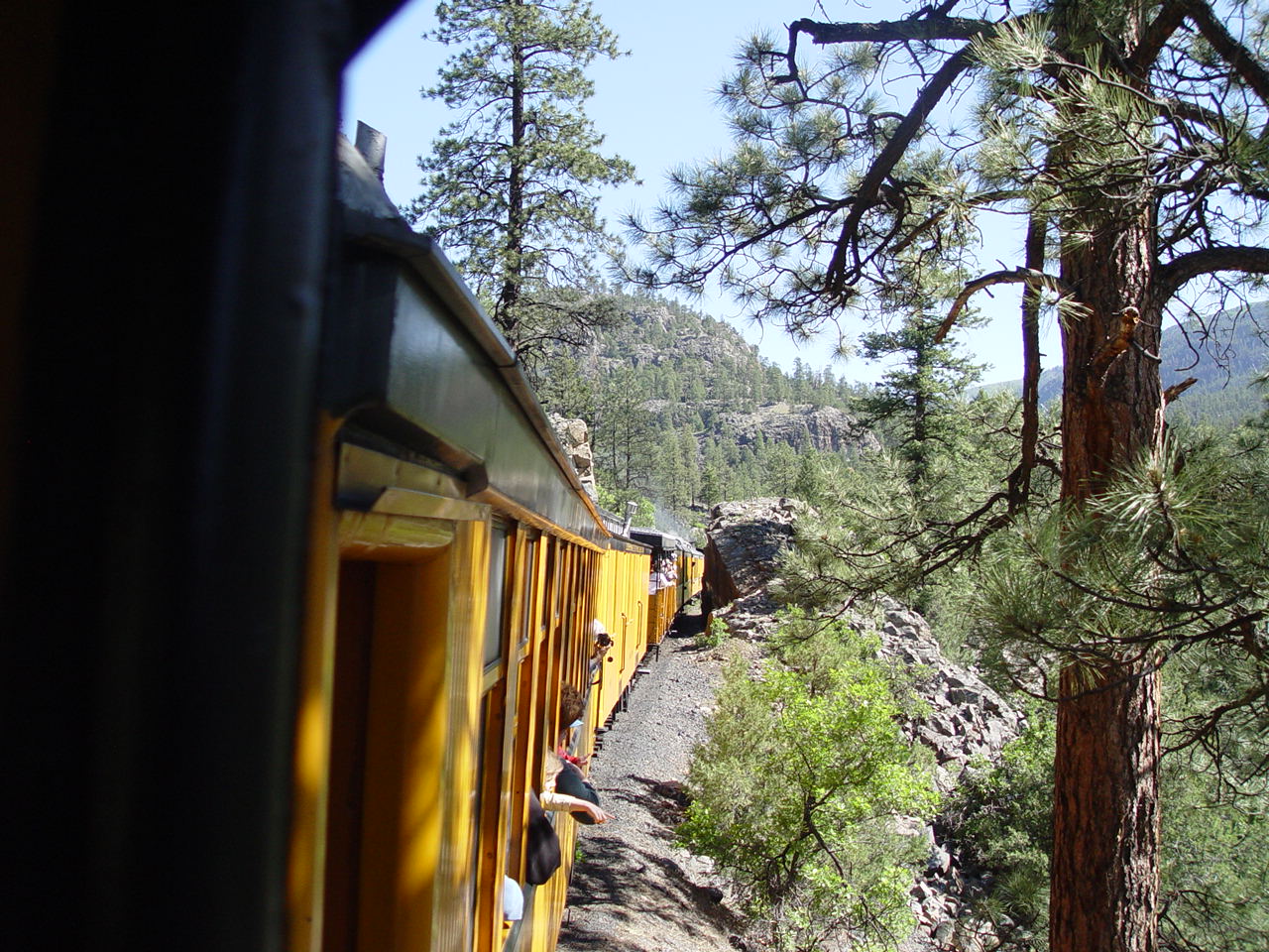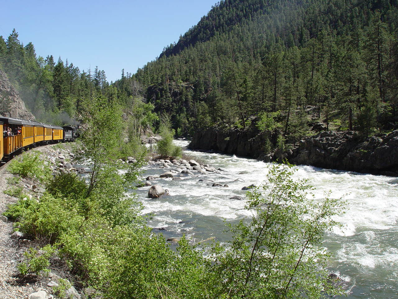 | Looking down at the Animas between the cars