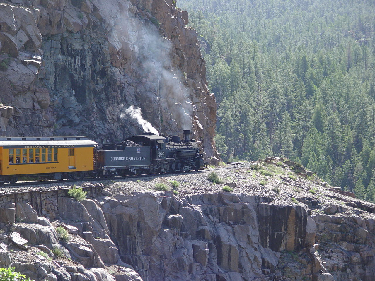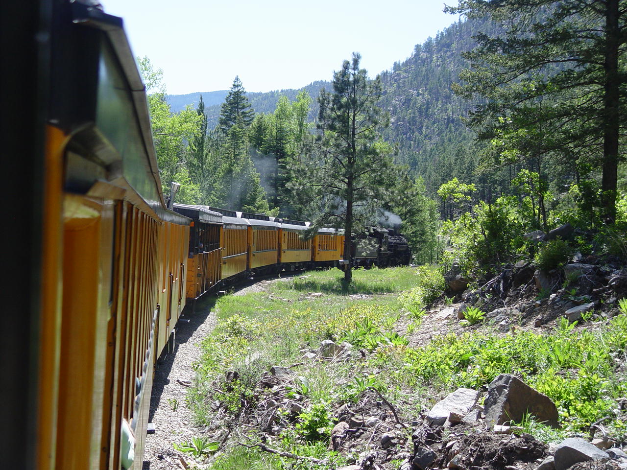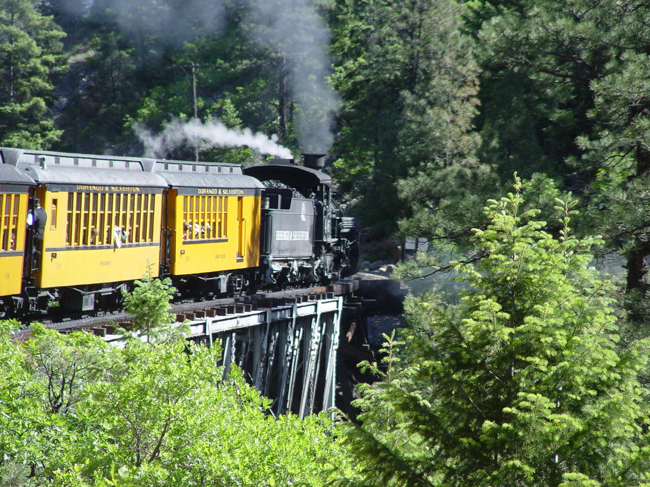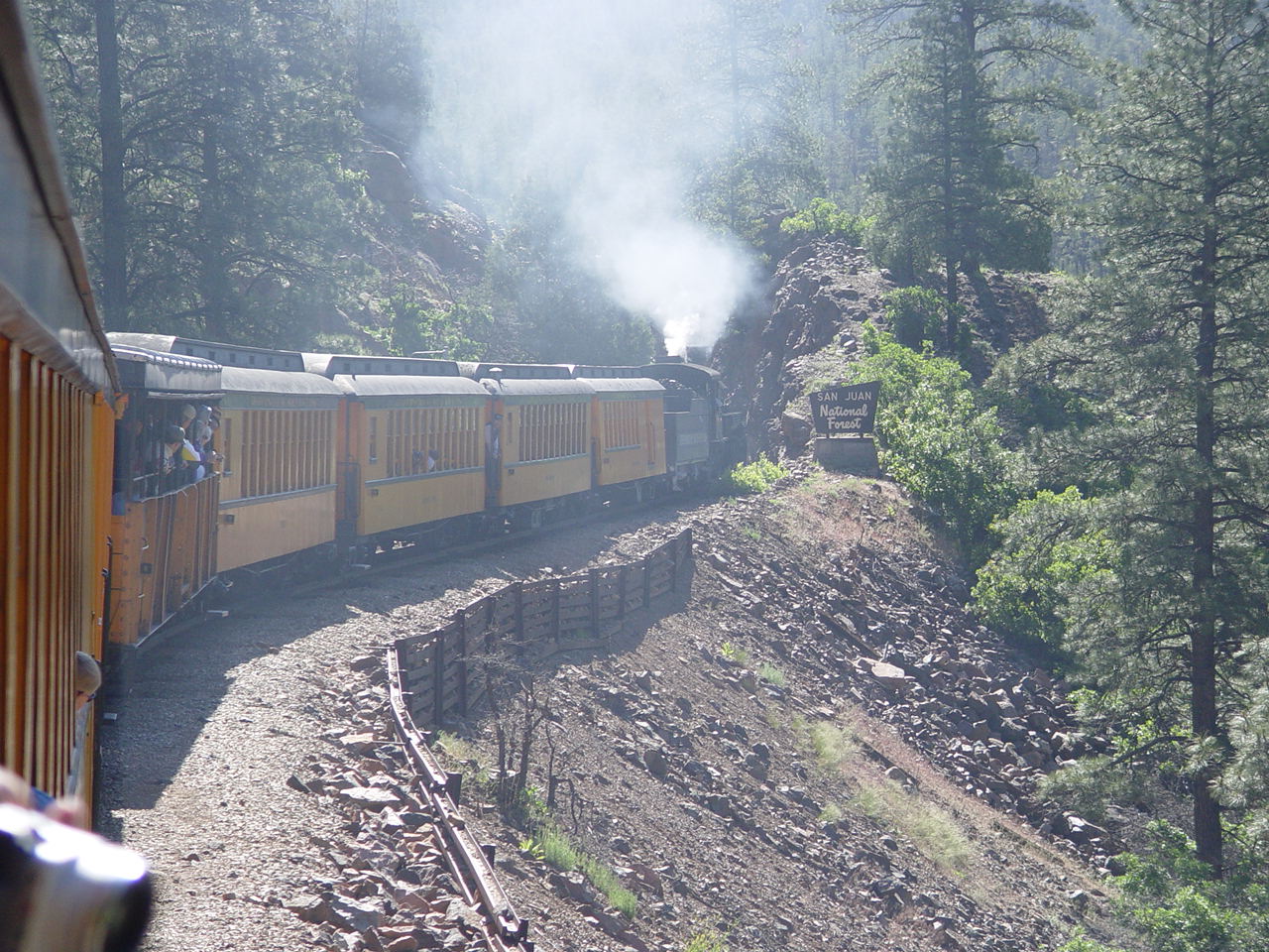 | Looking down at the Animas between the cars