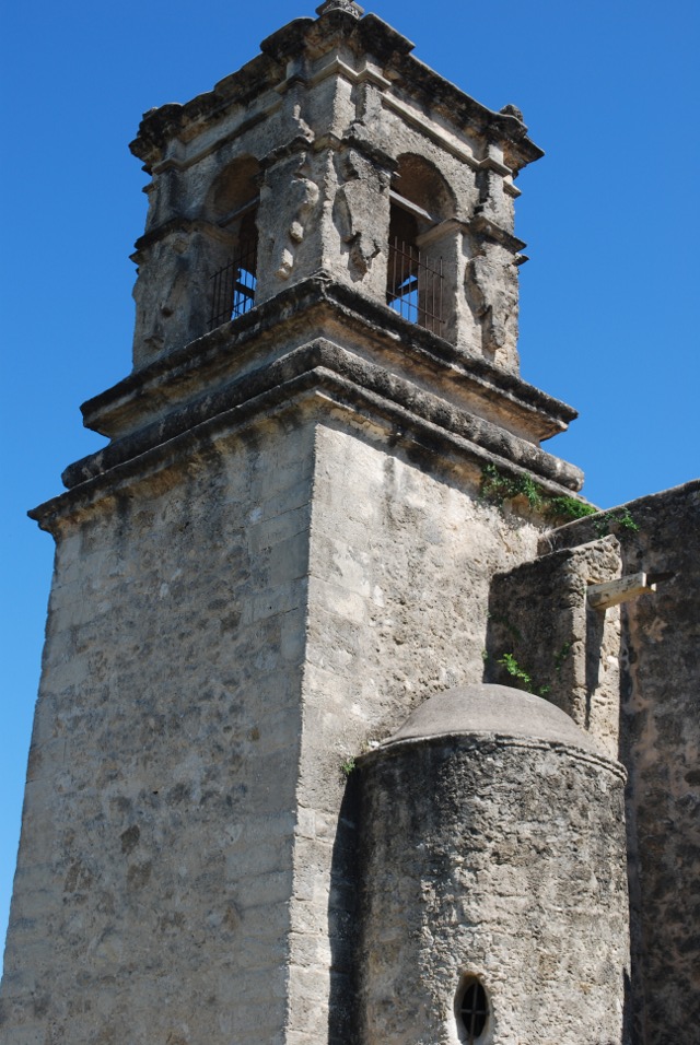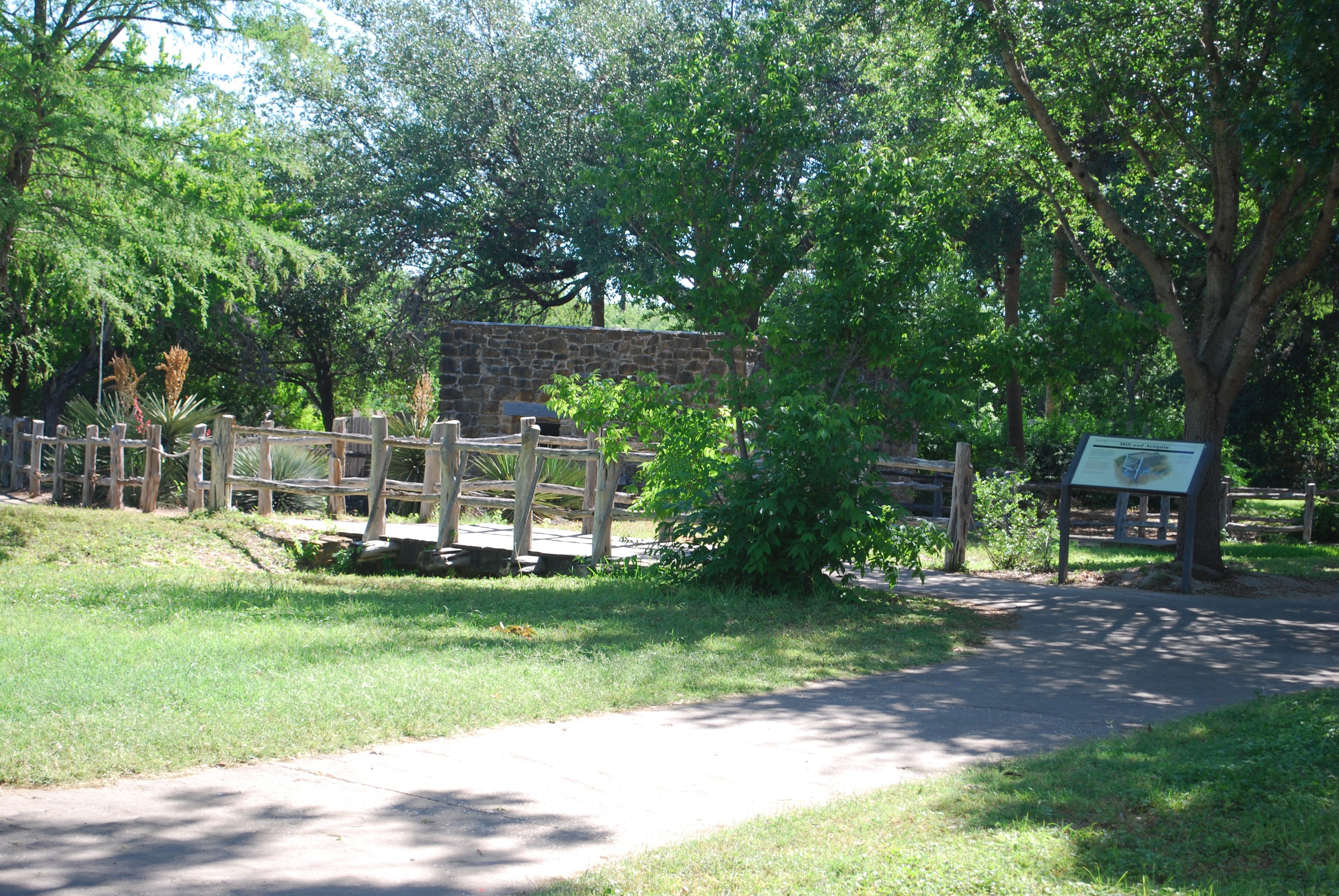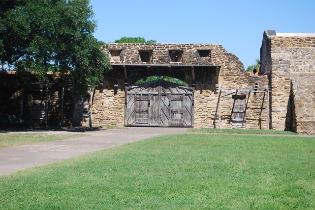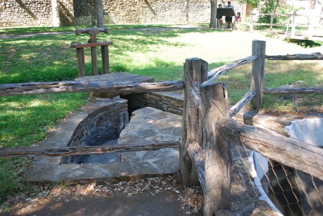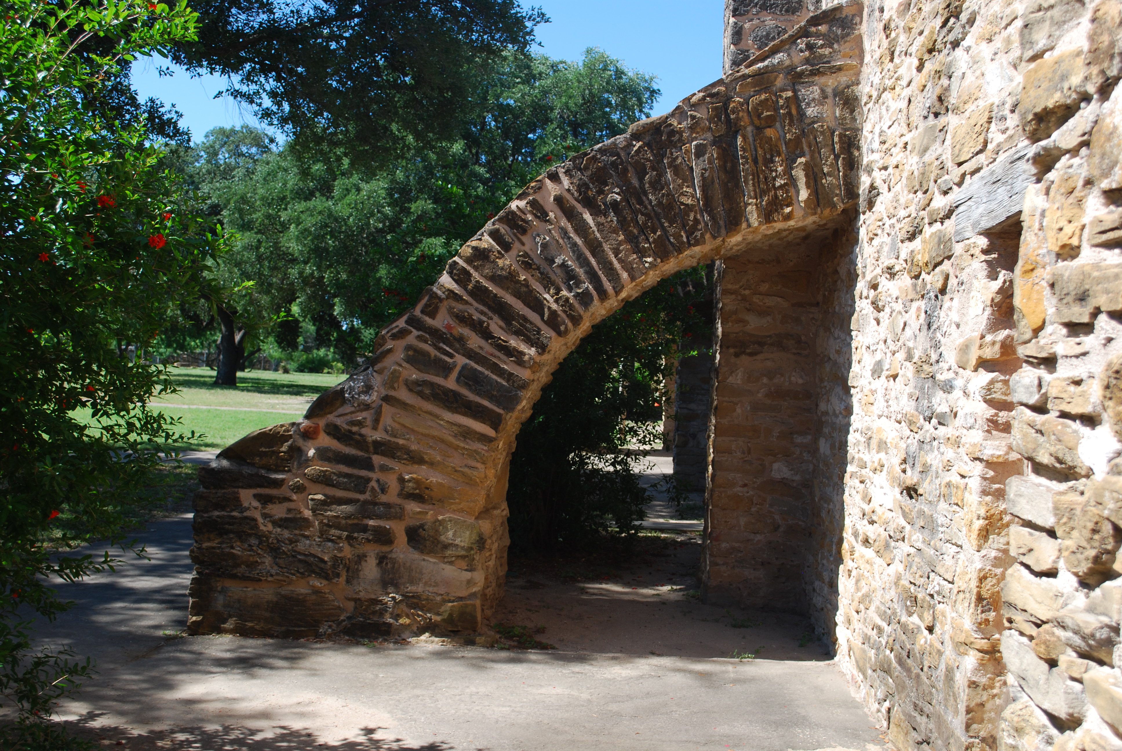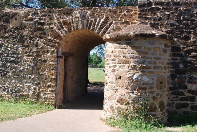 | Grist mill from the north gate. You can see the bridge over the acequia (aquaduct), bringing water to the grist mill. The acequia begins miles away, and takes water from the San Antonio river, then conducts it, by gravity, at a lower grade than the river, to the mission. The acequia at this point is well above the river's level. There are parts of the acequia system still carrying water in several San Antonio parks. |