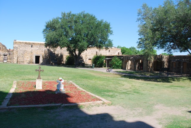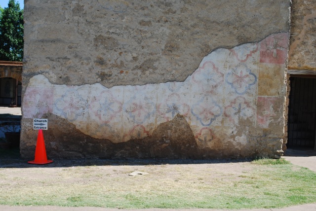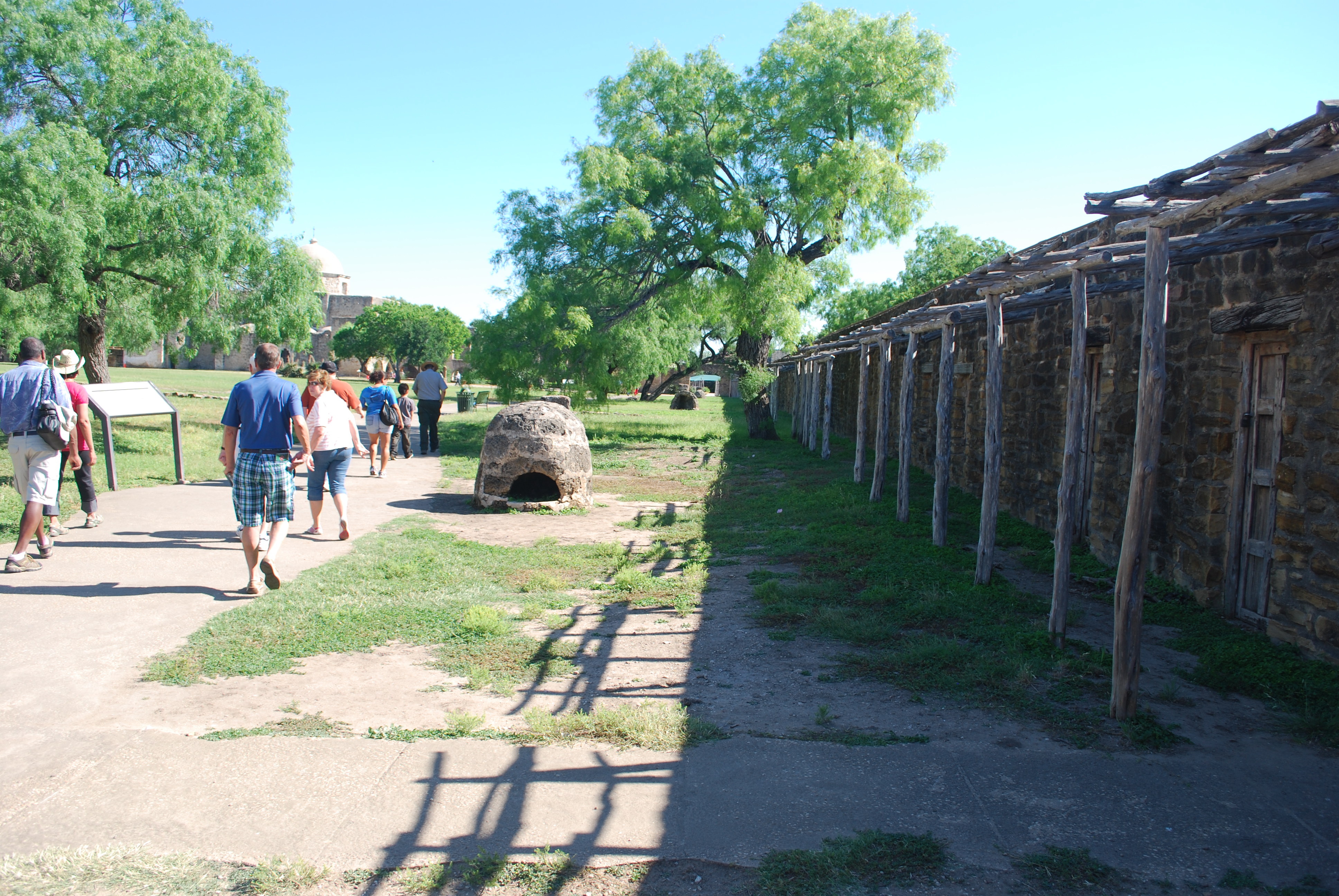 | The tour proceeds north along the east wall. You can see indian quarters apartments along the wall on the right and one of their cooking ovens in the center of the pic, the mission is in the background about 400 ft. from where I'm standing. Again, note the arbor frames in front of each apartment. |