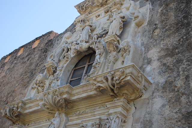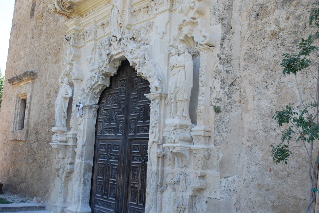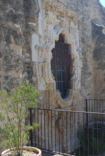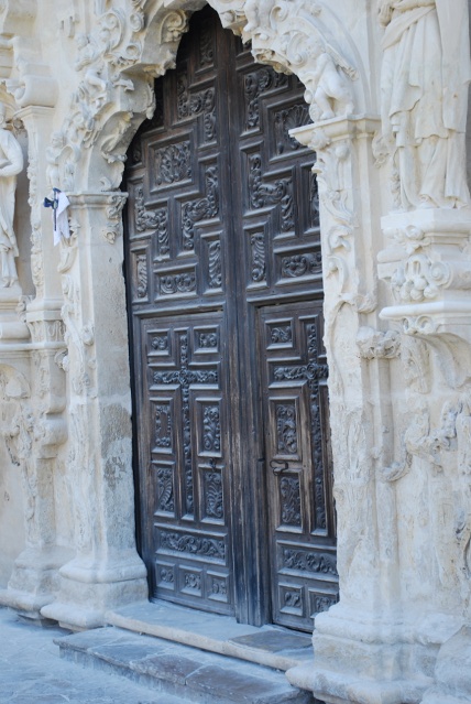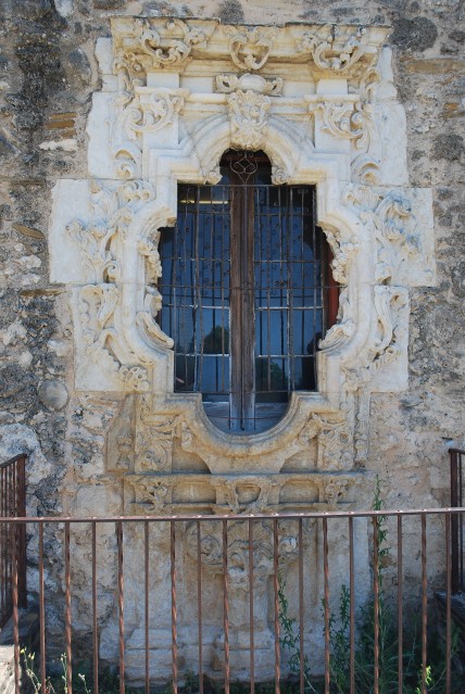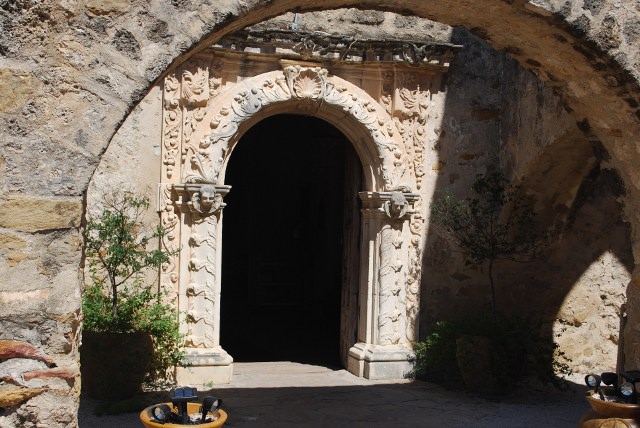 | The back or East chapel door and it's carvings. The ranger said the friars brought expert stone masons to carve and teach the indians. |