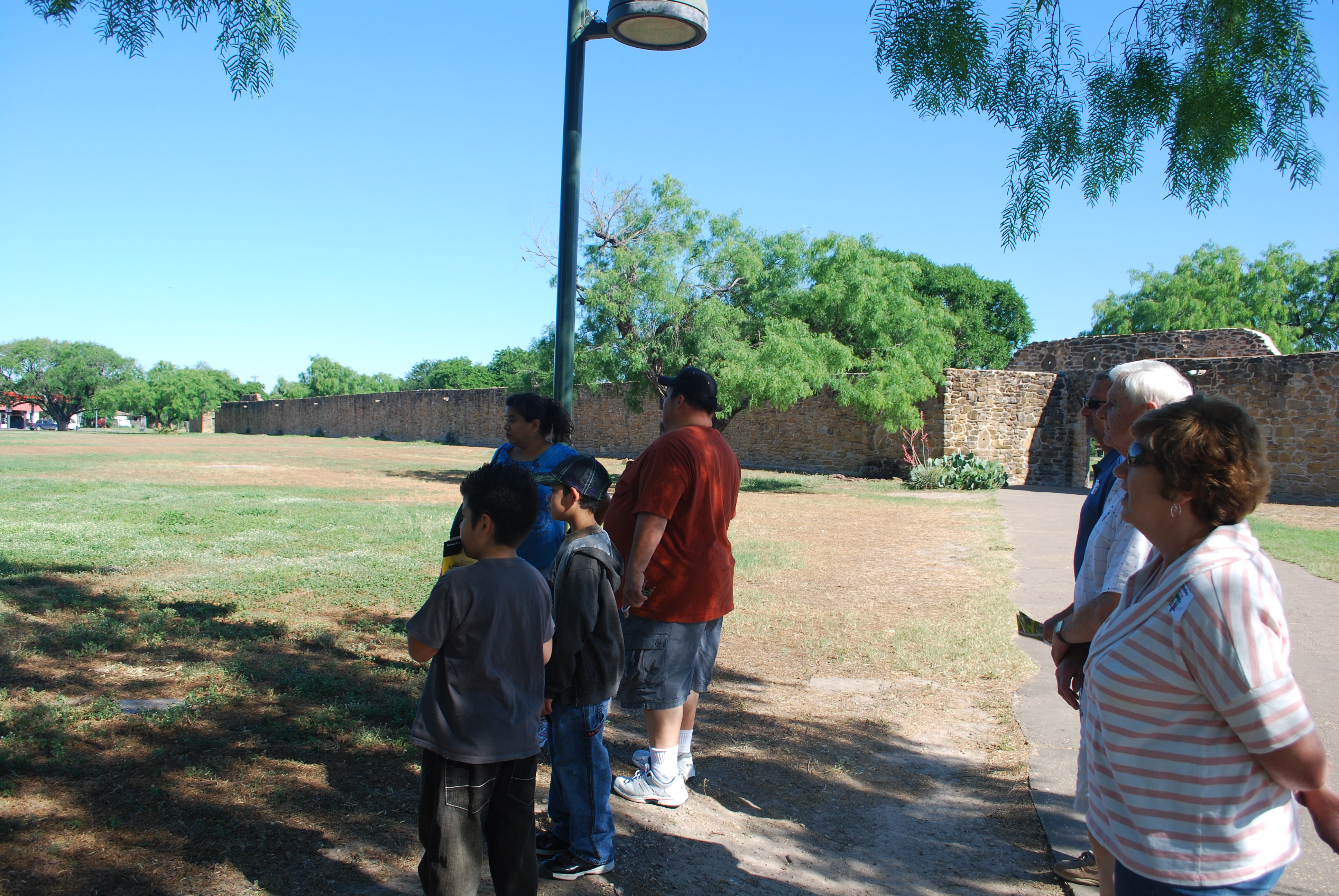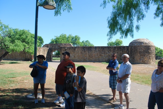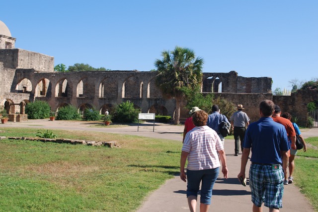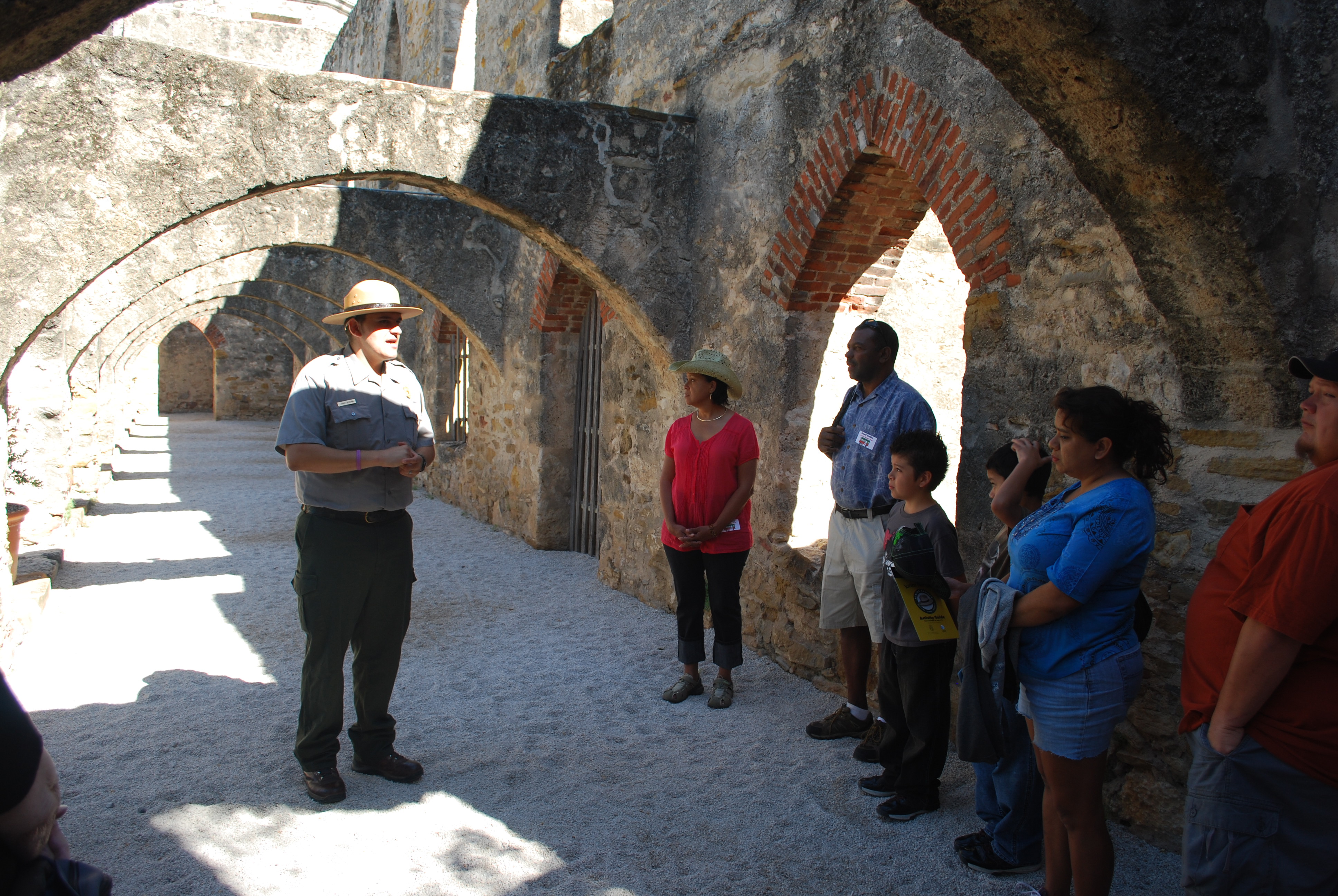 | The ranger talking on the porch of the convento. Architecture Note: The ranger said the arches into the quarters are Spanish arches, lined with brick and pointed at the top, while the porch above was supported by Moorish arches, round and smooth. I have also noticed a lot of Spanish arches that were round and smooth. |