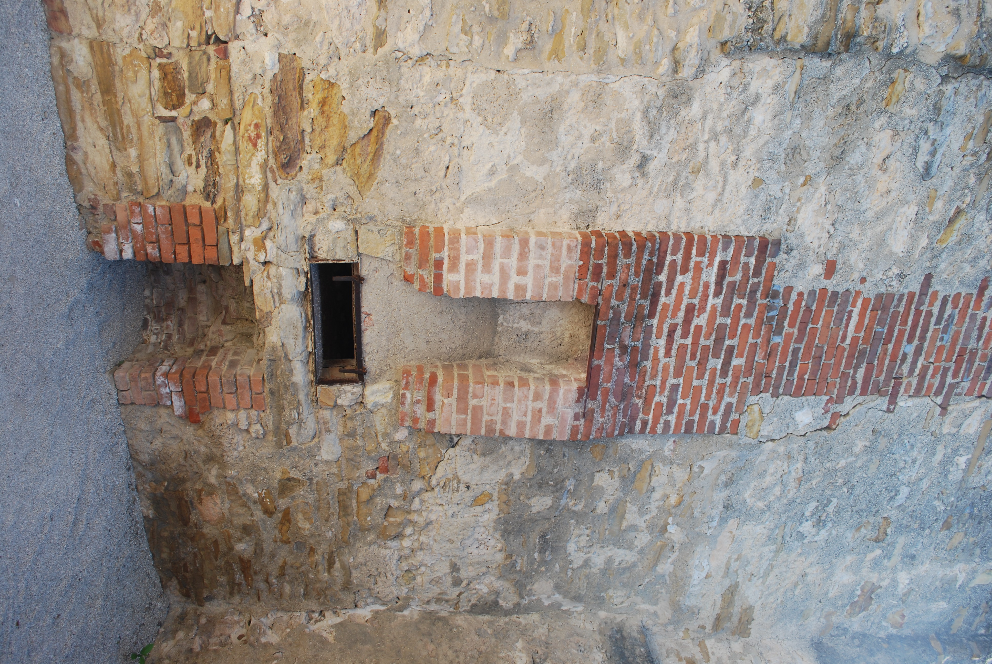| Partial interior shot of the south east turret. You can see the large cannon loop holes below and the rifle loop holes above the shooting platform. |