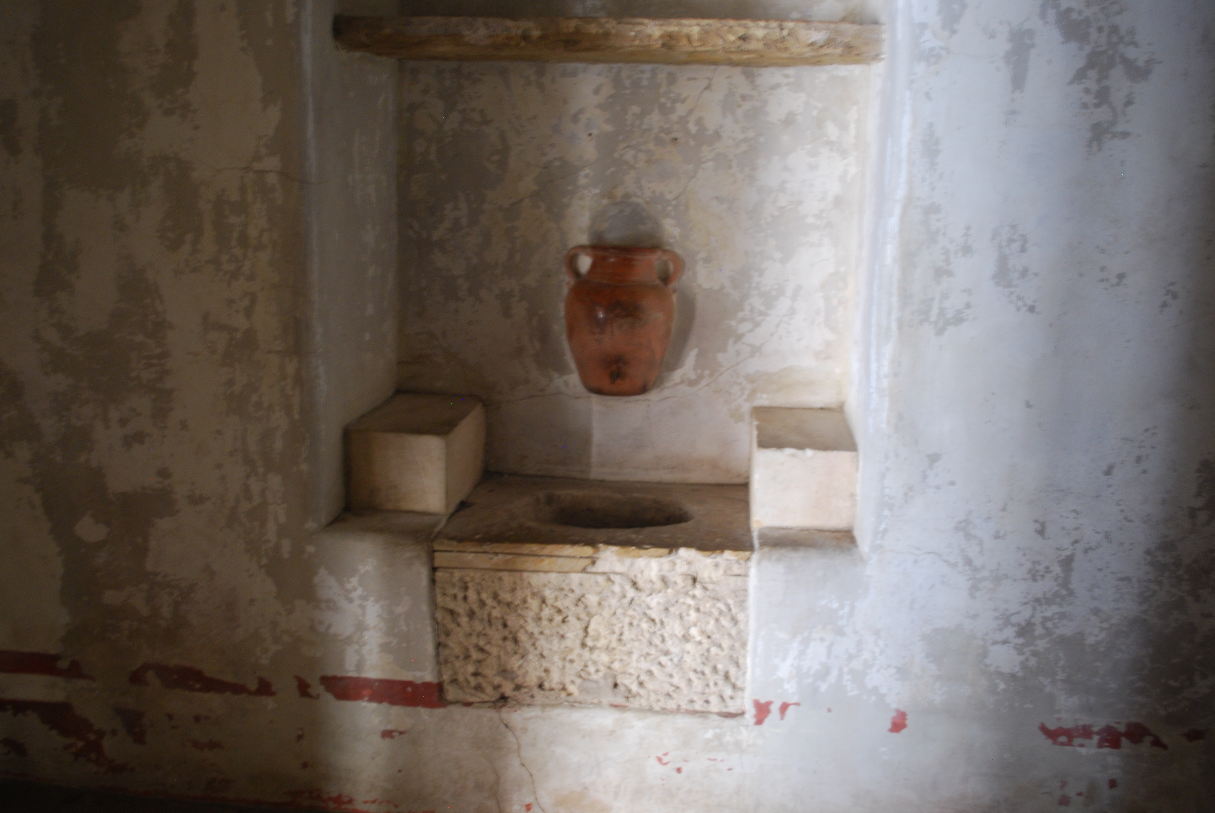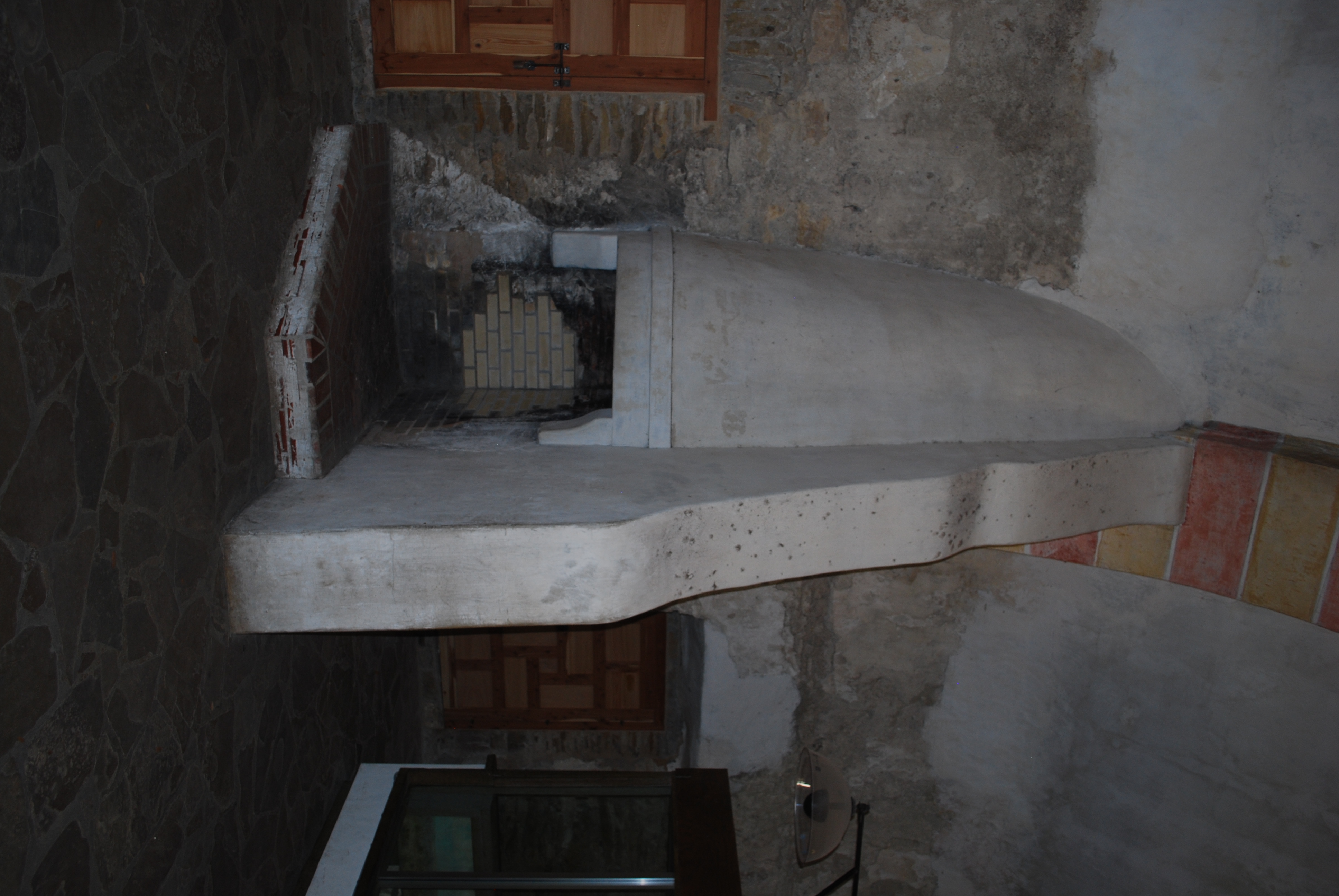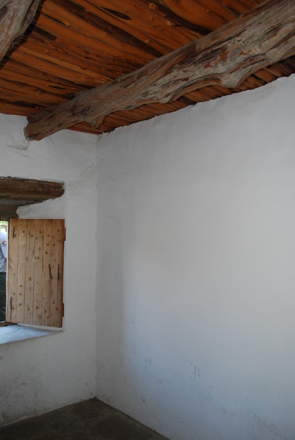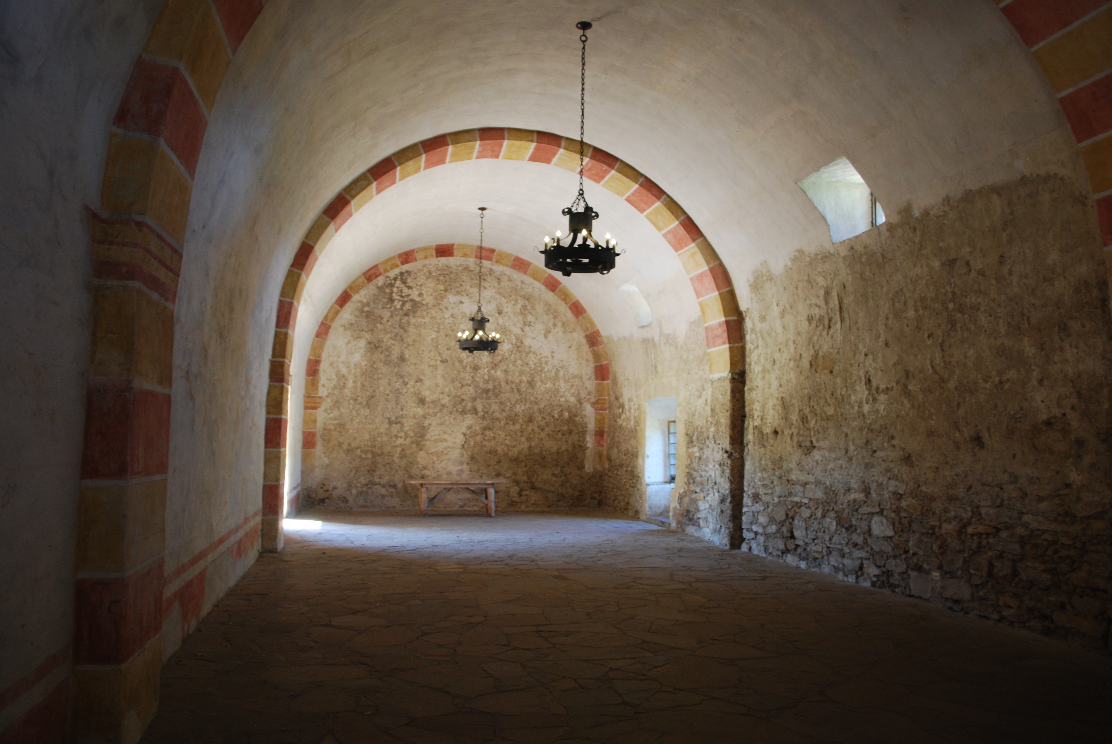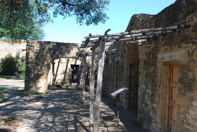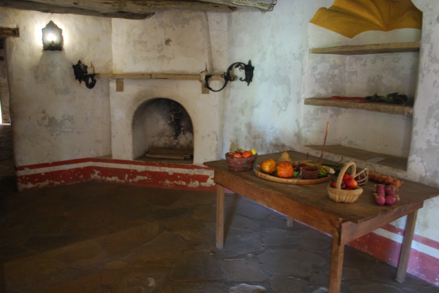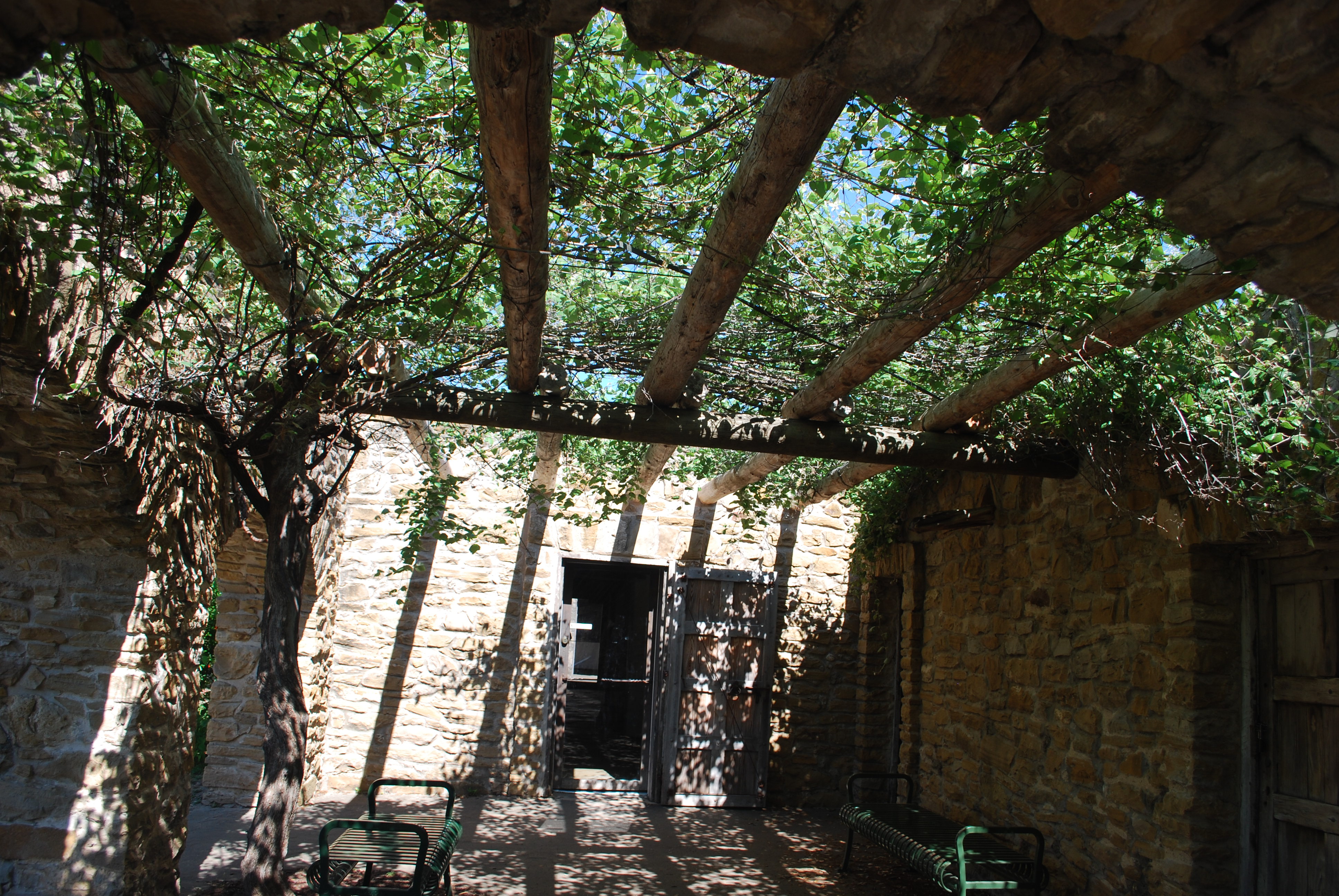 | The Friar's (monk's) eating and working area. The granary is on the left, the chapel is behind me and to the left. The trellis work above the doors were covered by vines and limbs, forming an arbor of sorts to provide shade and cool air just outside the doors and windows. |