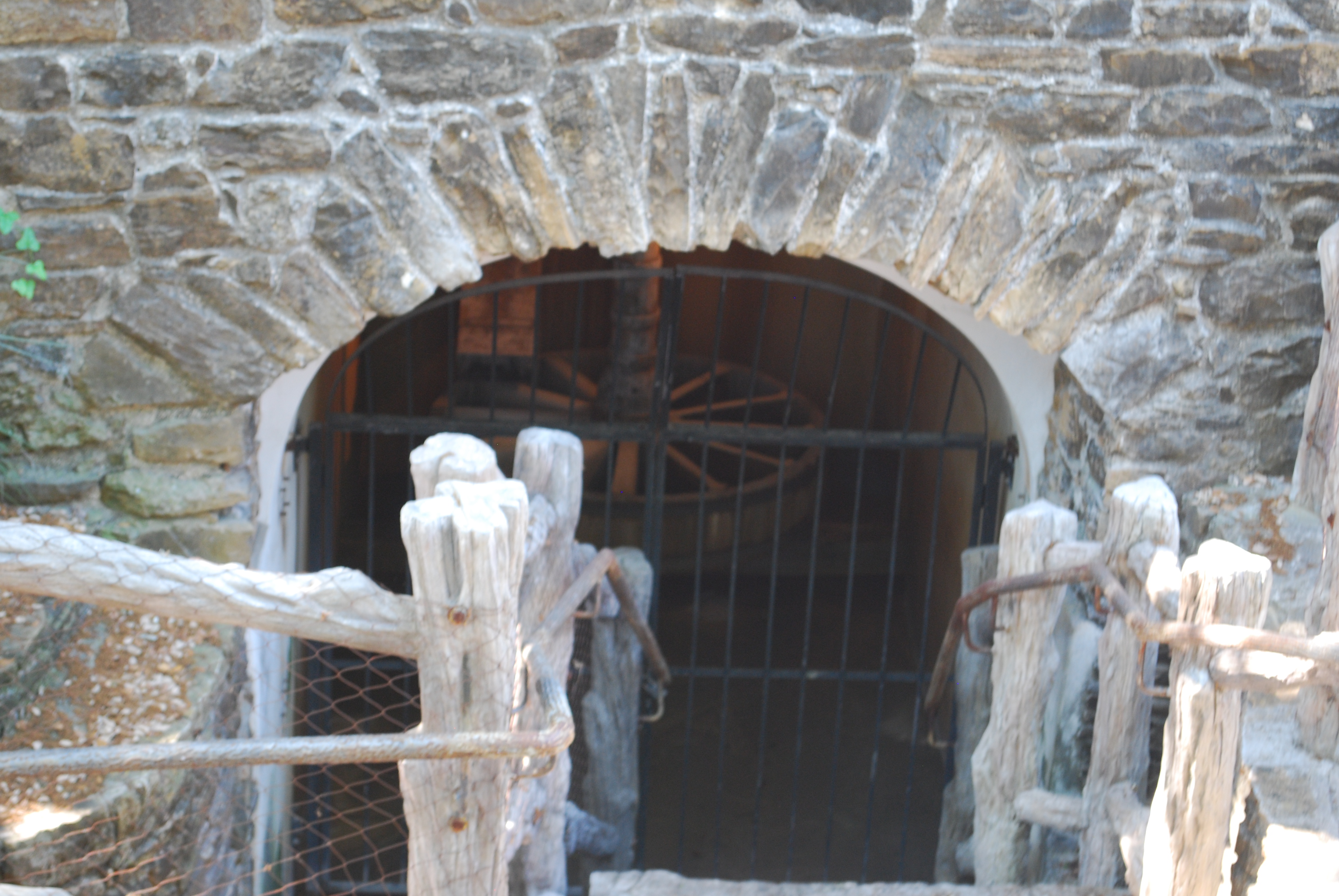 | The mill's water wheel, in the lower room, just below the bottom of the penstock, sorry I couldn't get closer. The water from the penstock, came through the wall at the opposite side, turning the wheel, then exited directly toward us, then to the left, and via the lower mill race back to the river. |