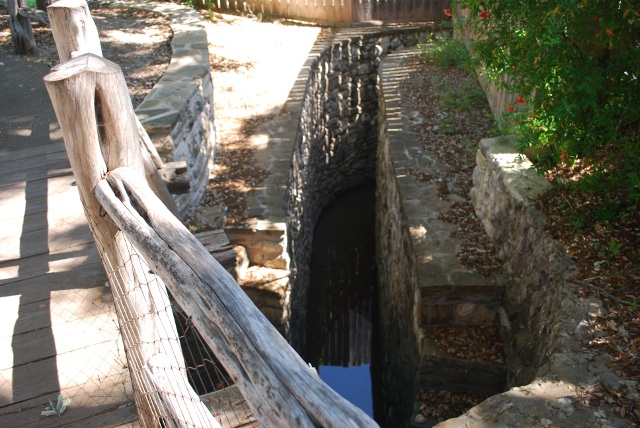 | Out-bound side of the mill race, leading back to the San Antonio River. Note it is much lower than the bottom of the penstock. |