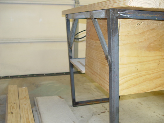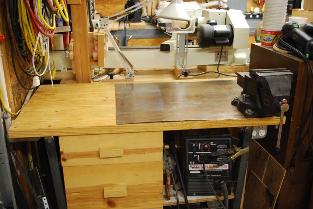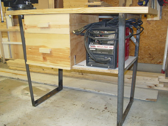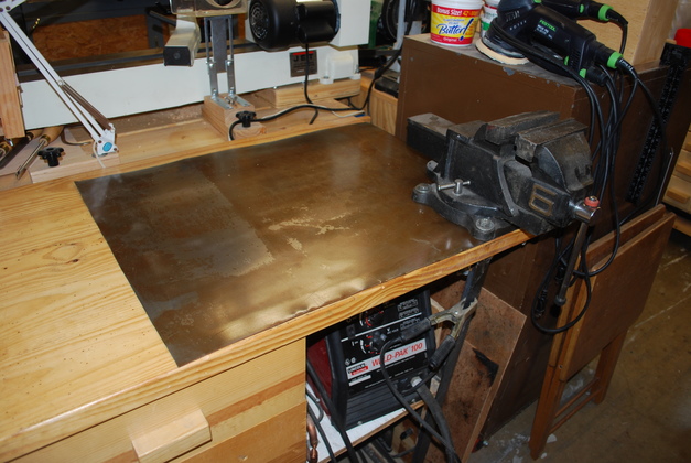 A later pic of the welding bench with a piece of sheet metal to protect the wood from welding sparks.