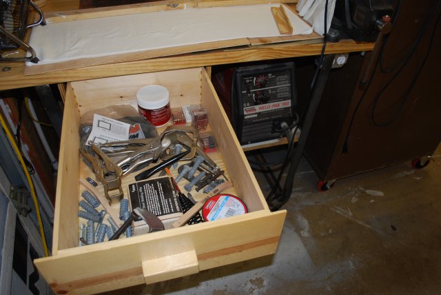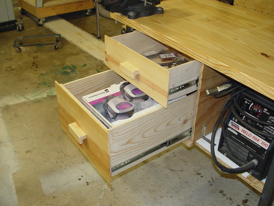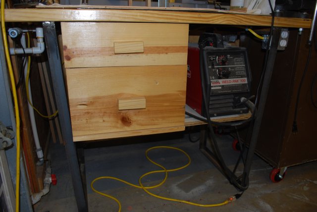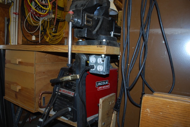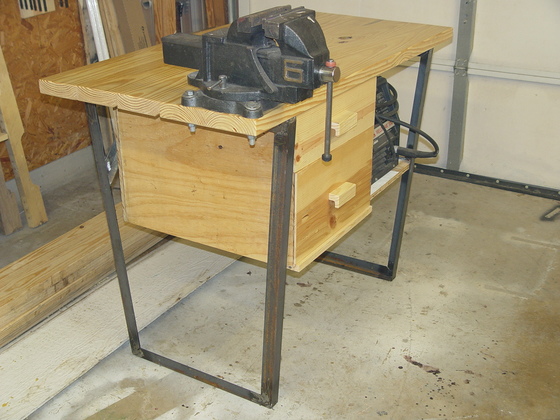 I mounted my 6" vise (for honking on stuff) on one corner, put a couple of drawers under it, and a small shelf to hold the welder.