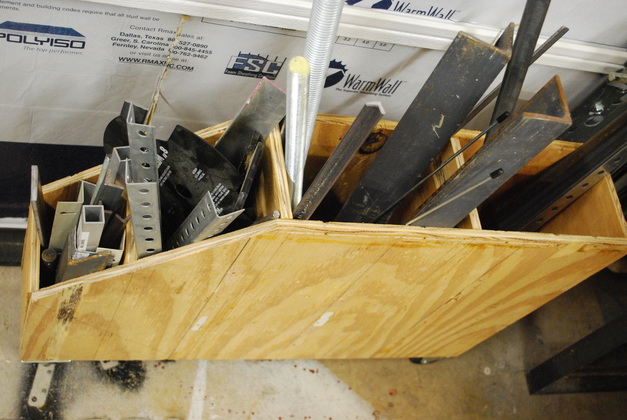 Closer look at where I store the metal odds-and-ends at the left end of the welding bench.