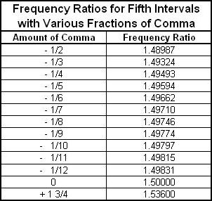 For example, to calculate the interval of a fifth minus 1/4 comma, us -0.25 for the value of x. This gives a frequency ratio of 1.49493. Here's a table of frequency ratios for the different fractions of comma. Using this table, you can easily calculate the frequencies for any temperament. |