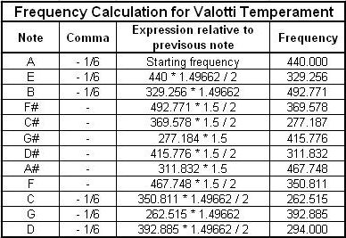 Here is an example of how to calculate the frequencies for the Valotti temperament. The Valotti temperament has six perfect fifth intervals and six intervals with –1/6 comma. The perfect fifths are B-F#, F#-C#, C#-G#, G#-Eb, Eb-Bb and Bb-F. The –1/6 comma fifths are C-G, G-D, D-A, A-E, E-B and F-C. The frequency ratio for a perfect fifth is 1.5 and for a –1/6 comma is 1.49662. The following table shows the series of calculations. Several times there will be division by two to keep the frequencies in the same octave. Start on A = 440 Hz and use the frequency ratios to go around the circle of fifths. |
