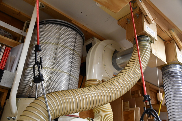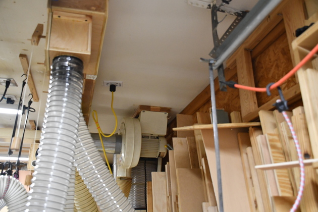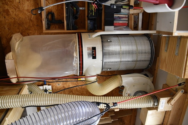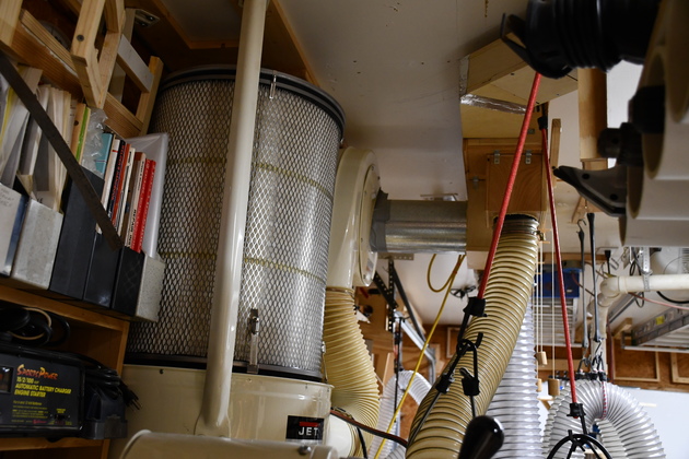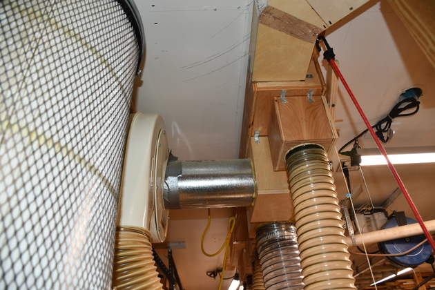 These are pics of the Jet DC-1100 after I moved it to the ceiling and with a 6" Plenum on the ceiling and numerous updraft valves. I have subesequently replaced the Jet seperator with a 6" cyclone and built a shelf for the Wynne filter.
